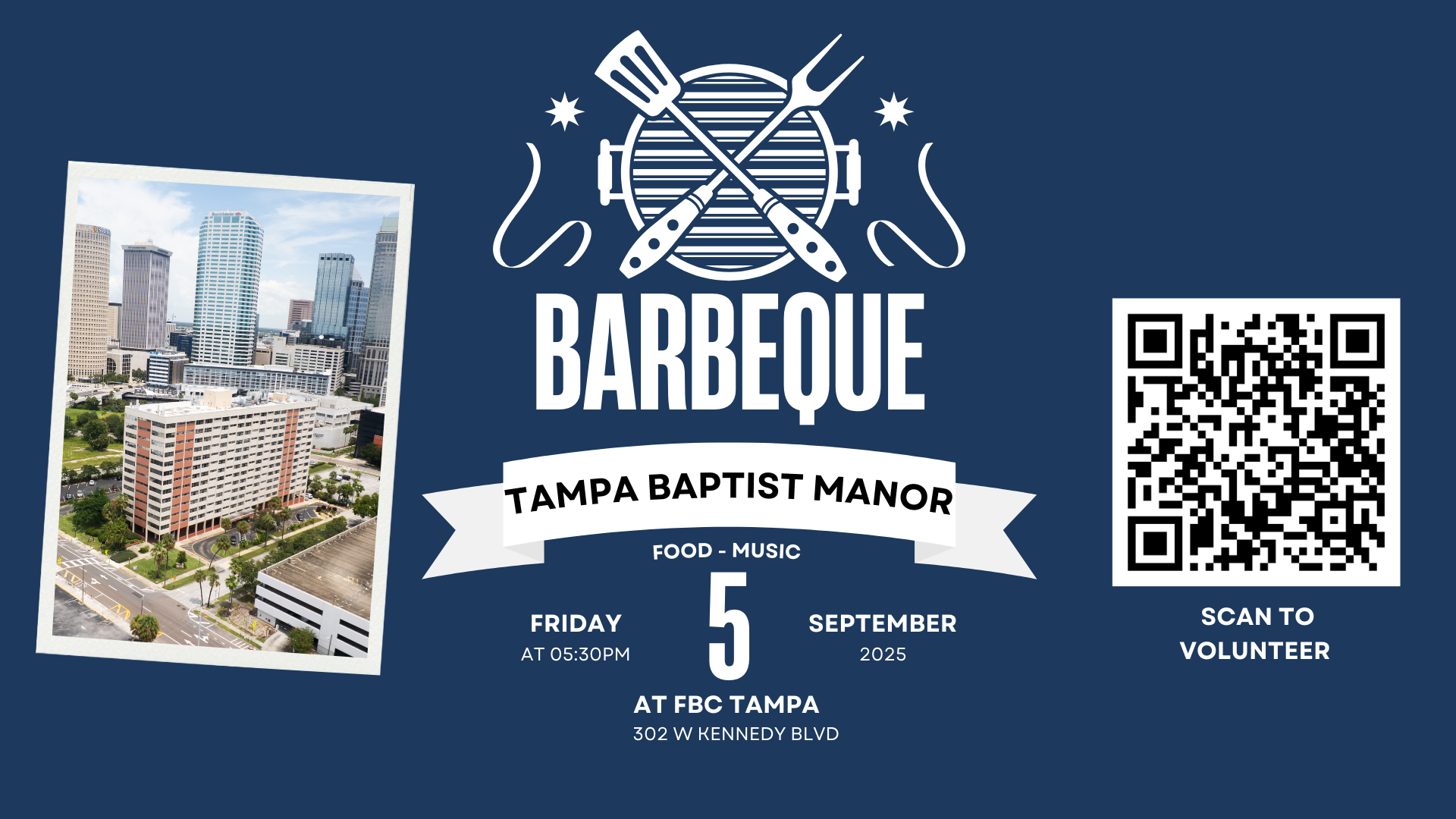 Join us for a fun night of fellowship as we serve the residents of Tampa Baptist Manor with a BBQ! We'll meet at 5:15 PM at the church and walk over to the manor at 5:30 PM. Don't miss out—you never know, Delvis might even make an appearance! We hope to see you there!