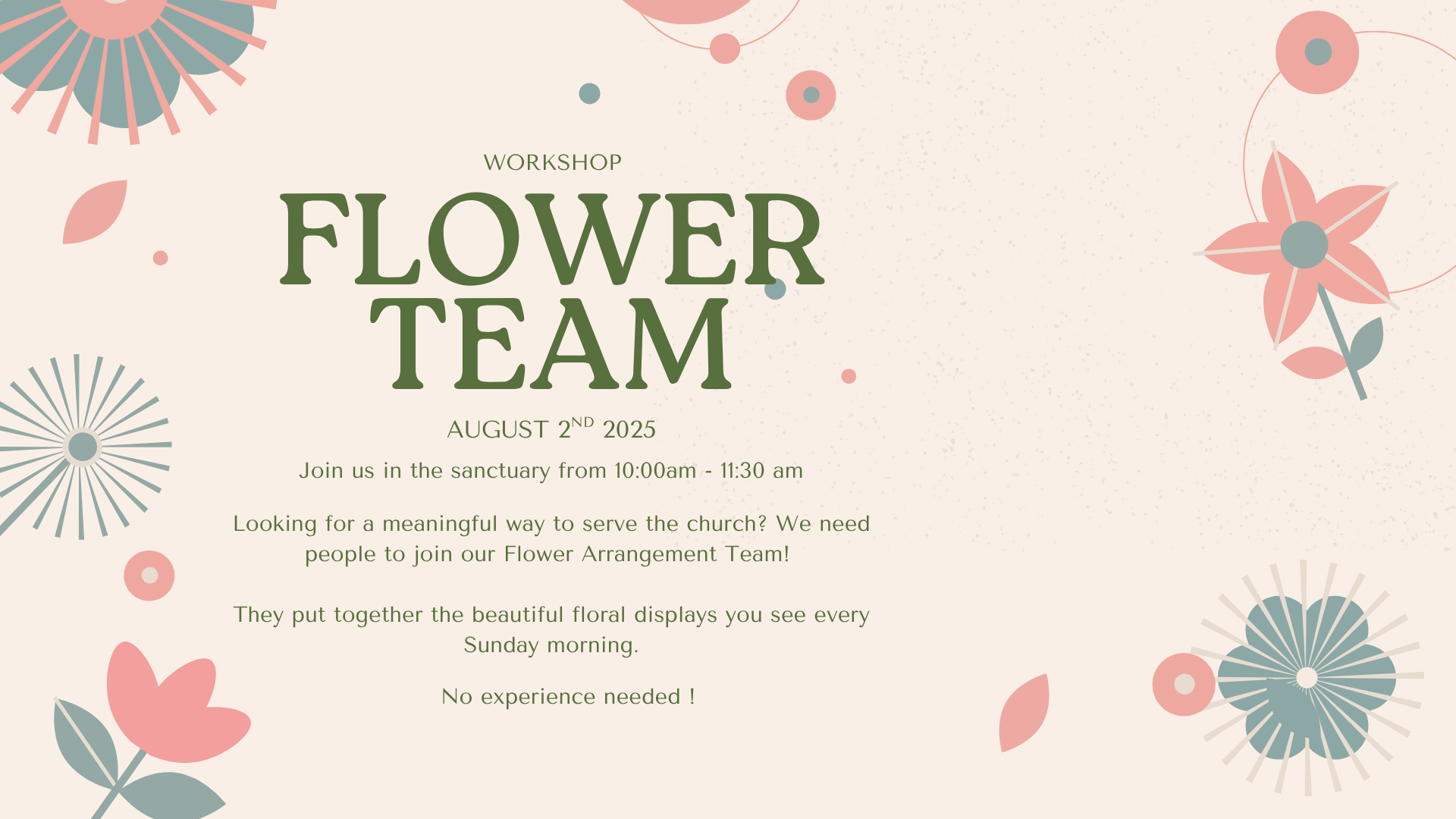 Looking for a meaningful way to serve the church? We need people to join our Flower Arrangement Team! They put together the beautiful floral displays you see every Sunday morning. No experience needed ! If you are interested please register here https://forms.gle/TCECp2TfYPTDSjSo8